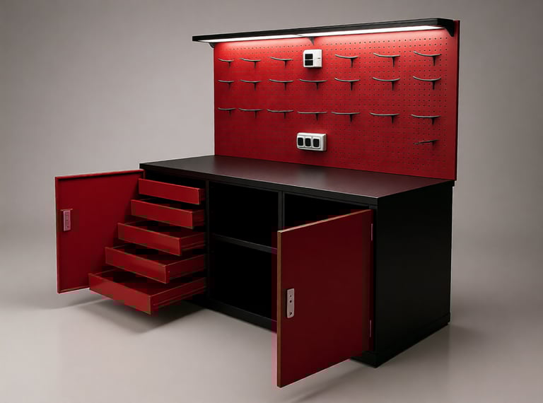 Darbo stalai, įrankių spintelės, lentynos;